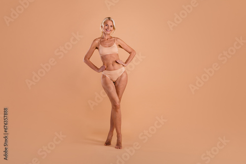 © deagreez, Fototapeta premium Full length photo of charming sweet senior lady dressed lingerie walking empty space isolated beige color background