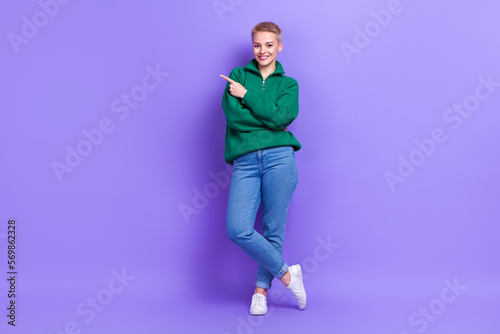 © deagreez, Fototapeta premium Full length photo of confident adorable lady wear green sweater pointing empty space isolated violet color background