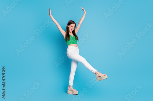 Fototapeta premium full length photo of crazy candid girl scream raise hands enjoy free time holiday wear good look clothes isolated over blue color background