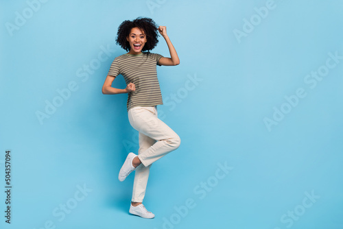 © deagreez, Fototapeta premium Full length photo of delighted lady rejoicing fist up win lottery isolated on blue color background