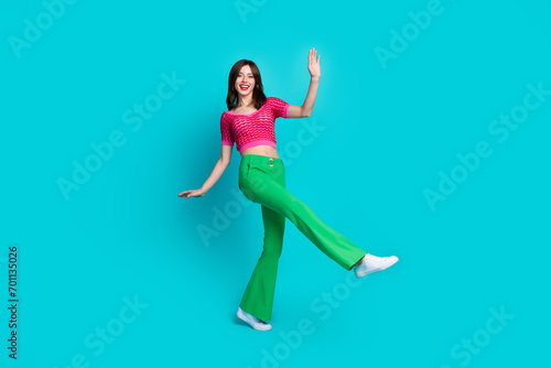 Obraz premium Full length photo of friendly optimistic woman dressed knitwear top green retro pants dancing have fun isolated on blue color background