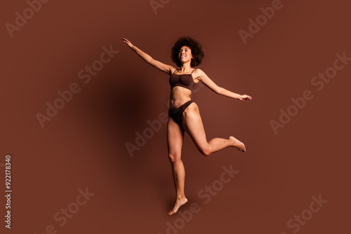 © deagreez, Obraz premium Full length photo of funky carefree lady underwear jumping loving body positive isolated brown color background