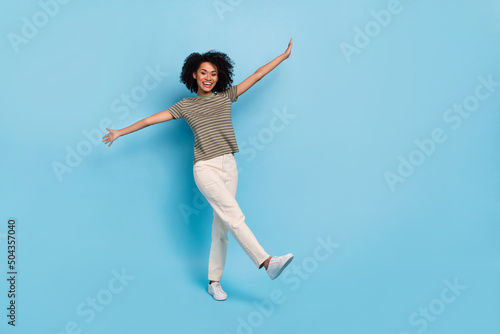 Fototapeta premium Full length photo of good mood lady hold hands playing flying plane isolated on blue color background
