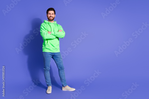 © deagreez, Fototapeta premium Full length photo of handsome young guy crossed hands confident dressed stylish green garment isolated on violet color background