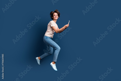 © deagreez, Fototapeta premium Full length photo of lovely young lady running hold telephone hurry shopping dressed white garment isolated on dark blue color background