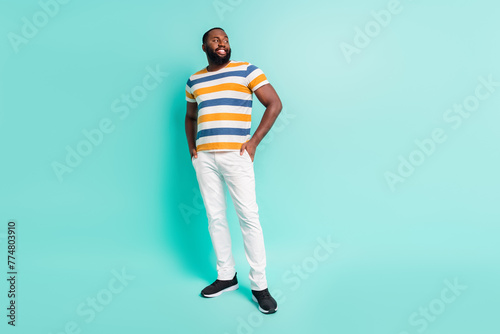 Fototapeta premium Full length photo of positive dreamy man wear striped t-shirt looking empty space isolated turquoise color background