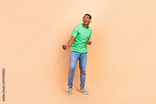 © deagreez, Fototapeta premium Full length photo of positive man wear stylish t-shirt jeans in headphones dancing look empty space isolated on beige color background