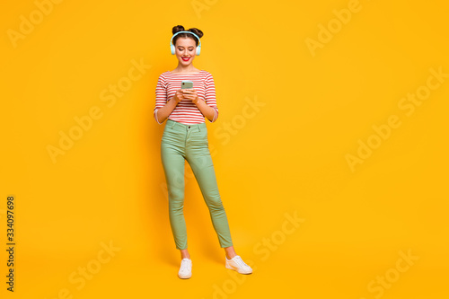 © deagreez, Fototapeta premium Full length photo of pretty lady use telephone turn on favorite melody modern technology earphones wear red white shirt green pants footwear isolated bright yellow color background