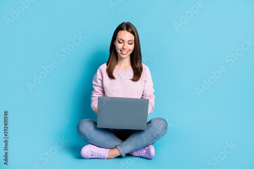 © deagreez, Naklejka premium Full length photo of pretty lovely student girl sitting floor crossed legs hold netbook remote communication concept wear violet pullover sneakers denim isolated blue color background