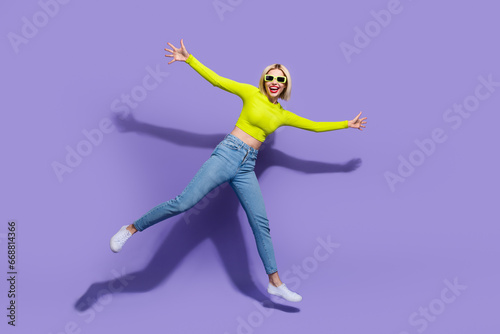 © deagreez, Obraz premium Full length photo of satisfied optimistic girl wear trendy clothes rejoice have fun walk empty space isolated on purple color background