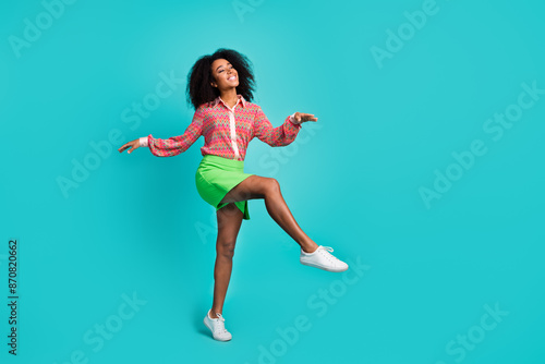 © deagreez, Fototapeta premium Full length photo of shiny attractive lady dressed print blouse walking dancing empty space isolated teal color background