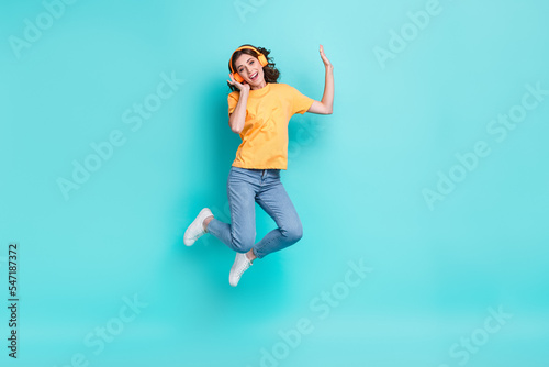 © deagreez, Obraz premium Full length photo of shiny pretty lady wear yellow t-shirt jumping high enjoying music isolated turquoise color background