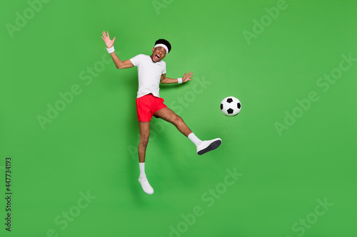Fototapeta premium Full length photo of strong excited dark skin guy dressed sport outfit jumping playing football isolated green color background
