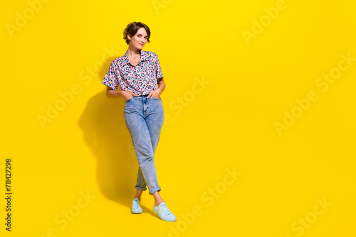 © deagreez, Fototapeta premium Full length photo of stunning lovely person put arms pockets posing empty space information ad isolated on yellow color background