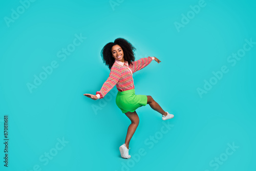 Obraz premium Full length photo of sweet pretty lady dressed print blouse dancing empty...