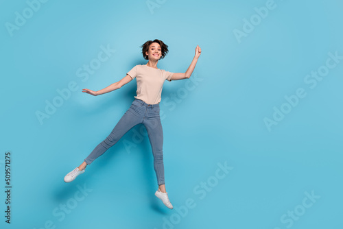 Fototapeta premium Full length photo of sweet pretty woman wear beige t-shirt jumping high empty space isolated blue color background