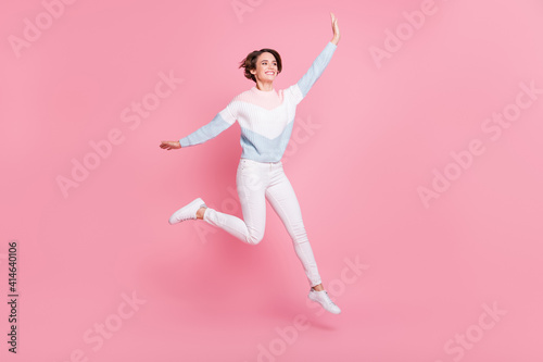 Fototapeta premium Full length photo portrait of excited girl jumping up isolated on pastel pink...