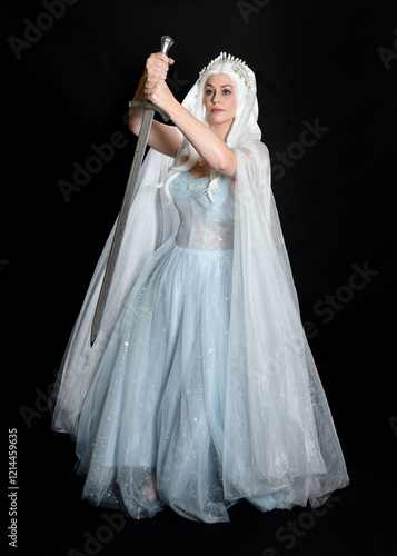 © faestock, Fototapeta premium full length portrait beautiful blonde fantasy maiden faery wearing medieval fairytale ballgown costume, flowing white hooded cape. standing pose holding a sword weapon, isolated dark studio background