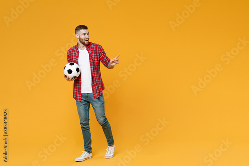 © ViDi Studio, Fototapeta premium Full length portrait funny young man football fan in red shirt cheer up support favorite team with soccer ball pointing index finger aside isolated on yellow background. People sport leisure concept.