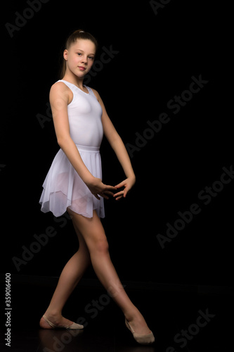 Naklejka premium Full length portrait of a charming gymnast girl in elegant dress.
