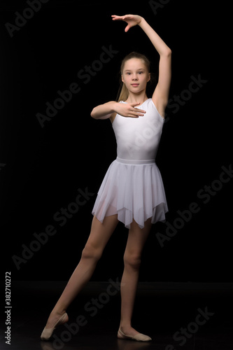 Fototapeta premium Full length portrait of a charming gymnast girl in elegant dress.
