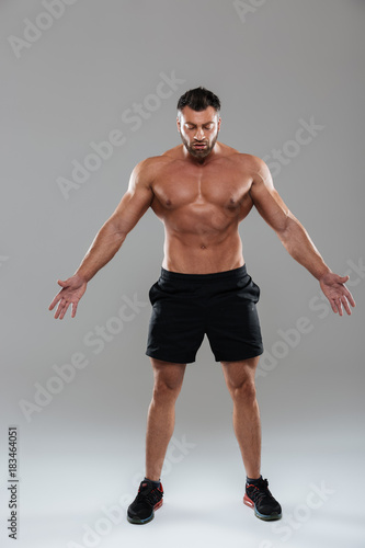 Obraz premium Full length portrait of a confident strong shirtless male bodybuilder