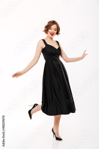 Naklejka premium Full length portrait of a lovely girl dressed in dress pointing finger at a...