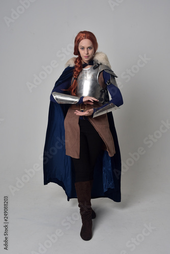 Naklejka premium full length portrait of a red haired girl wearing medieval warrior costume and steel armour and a fur cloak, standing pose on grey studio background.