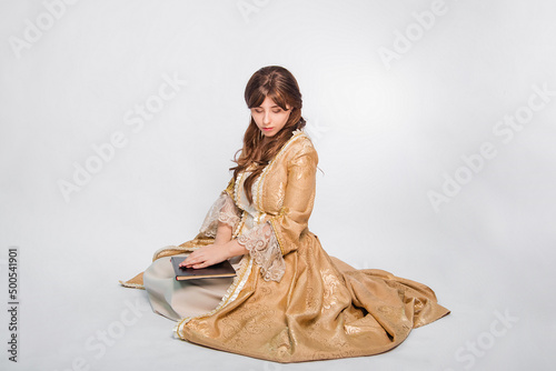 © Михаил Гута, Naklejka premium Full length portrait of a young woman in a puffy gold dress in the rococo era, posing while sitting with a book in her hands, isolated on a white background. The girl is reading a book.