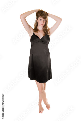 Fototapeta premium Full length portrait of a young woman wearing an elegant black evening dress, isolated in front of white studio background