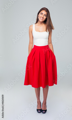 © Drobot Dean, Naklejka premium Full length portrait of attractive smiling woman in skirt posing over gray background and looking at camera