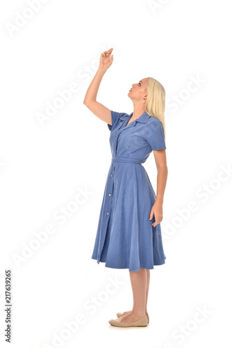 Fototapeta premium full length portrait of blonde girl wearing blue dress, standing pose....