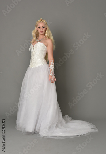 Fototapeta premium full length portrait of blonde girl wearing white corset gown. standing pose on grey studio background.