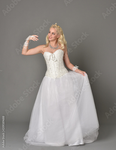 Fototapeta premium full length portrait of blonde girl wearing white corset gown. standing pose on grey studio background.