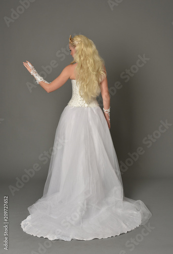 Fototapeta premium full length portrait of blonde girl wearing white gown, standing pose with...