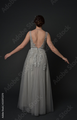 © faestock, Fototapeta premium full length portrait of brunette girl wearing beautiful long gown, standing pose with background to the camera on grey studio background.