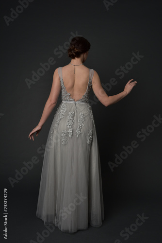 © faestock, Fototapeta premium full length portrait of brunette girl wearing beautiful long gown, standing pose with background to the camera on grey studio background.