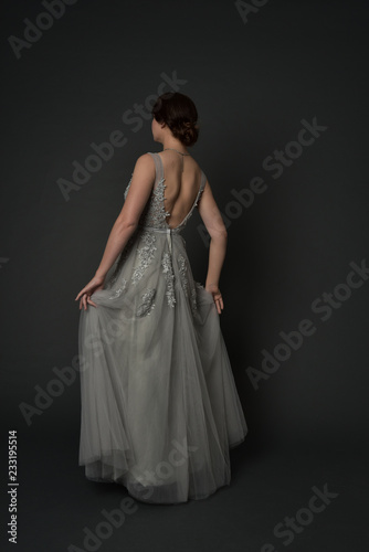 © faestock, Fototapeta premium full length portrait of brunette girl wearing beautiful long gown, standing pose with background to the camera on grey studio background.