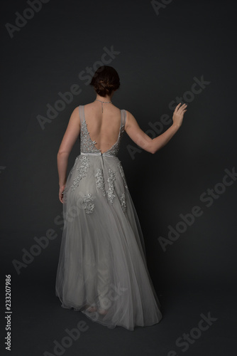 © faestock, Naklejka premium full length portrait of brunette girl wearing beautiful long gown, standing pose with background to the camera on grey studio background.