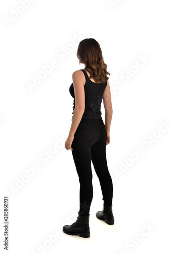 © faestock, Obraz premium full length portrait of brunette girl wearing black singlet, jeans jeans and boots. standing pose, with back view. isolated on white studio background.