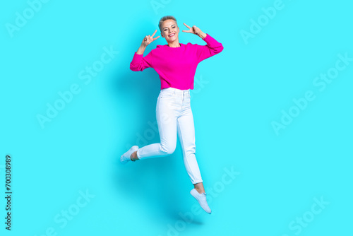 Fototapeta premium Full length portrait of excited carefree person jump demonstrate v-sign near...