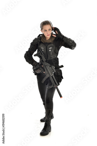 © faestock, Naklejka premium full length portrait of female soldier wearing black tactical armour, holding a rifle gun, isolated on white studio background.