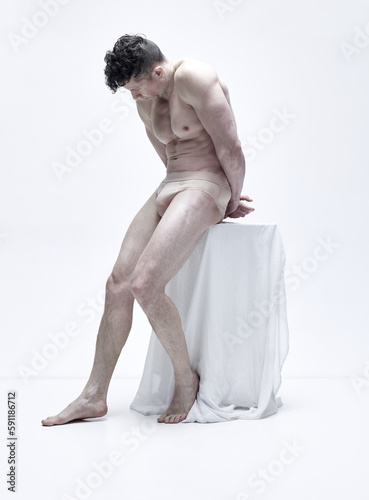 © master1305, Naklejka premium Full-length portrait of handsome man with attractive, strong, muscular body posing shirtless in underwear against white studio background. Male body aesthetics, men's beauty, inspiration, art concept