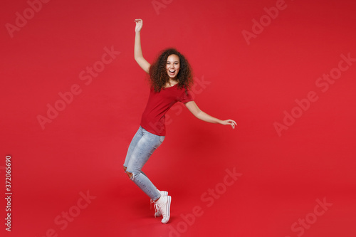 Fototapeta premium Full length portrait of laughing young african american girl in casual t-shirt isolated on red background studio. People lifestyle concept. Mock up copy space. Dancing, standing on toes, rising hands.