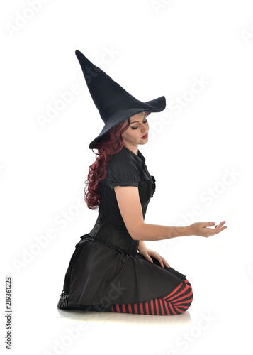Obraz premium full length portrait of red haired girl wearing black witch costume and pointy hat. seated pose, isolated on white studio background.