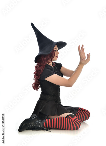 © faestock, Naklejka premium full length portrait of red haired girl wearing black witch costume and pointy hat. seated pose, isolated on white studio background.