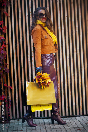 Fototapeta premium Full length portrait of smiling woman in trench coat