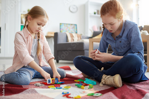 © Seventyfour, Fototapeta premium Full length portrait of two sisters playing with puzzles sitting on floor at home, copy space