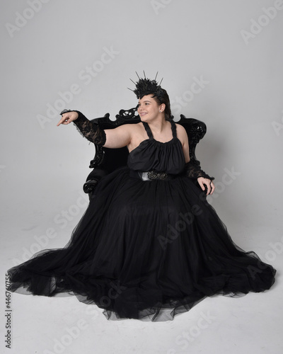 © faestock, Fototapeta premium Full length portrait of young plus sized woman with short hair, wearing long black tulle gothic gown with crown and gloves, sitting pose on a ornate throne chair on light studio background.