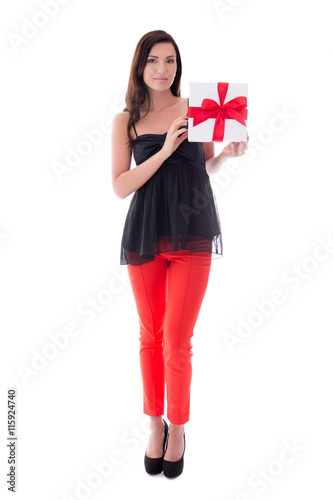 Fototapeta premium full length portrait of young woman with gift box isolated on wh